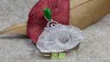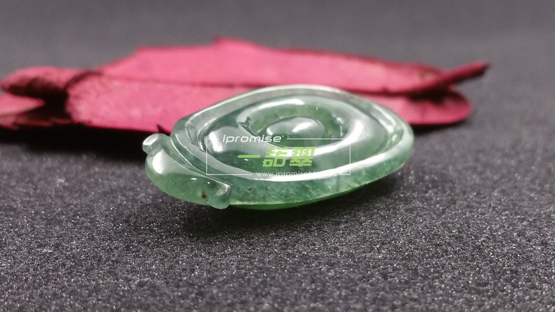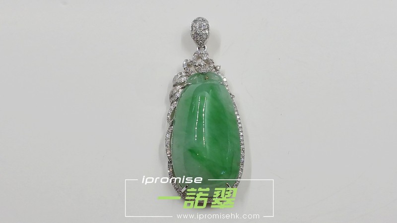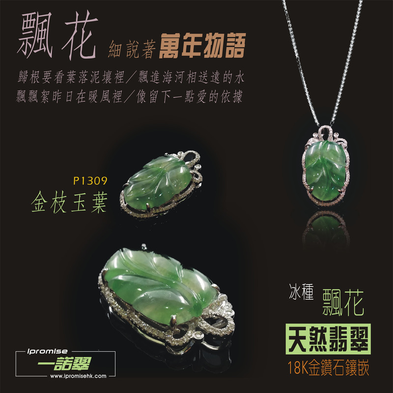 本品以冰種飄花翡翠雕琢,飄花色澤陽綠,造型小巧可愛,鑲工精湛。欣賞冰種飄花翡翠時,腦海中常會不自覺地哼出胡鴻鈞這首詞曲皆非常優美的《飄花》。