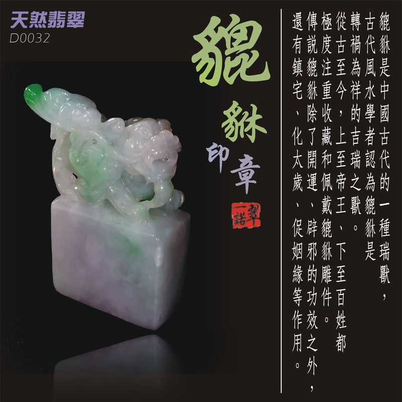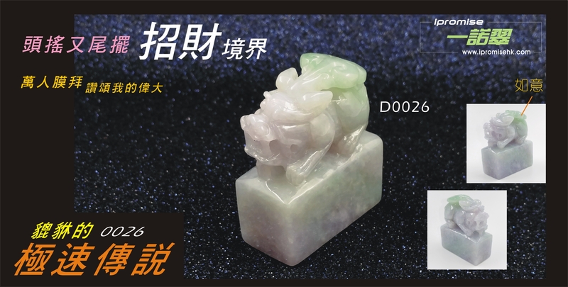 D0026 【春彩貔貅印章】已結緣 尺寸:40x47x18mm 重:82g 本品以春帶彩雙色(紫和綠)翡翠雕琢而成。雖然貔貅沒有如傳統口咬金錢,然而其背上負上一塊翠綠如意更顯特色,中國的如意圖案寓意萬事如意,值得收藏。