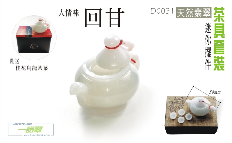 D0031(已售,多謝貴客支持) 茶具套裝,茶壺以原件翡翠雕琢而成,瓷白無瑕。品茶者著重茶後「回甘」,人情亦如是,與志趣相投好友相聚,分享喜樂,散席後,樂趣歷久不散,餘韻綿長,期待下次聚首,人情味回甘。