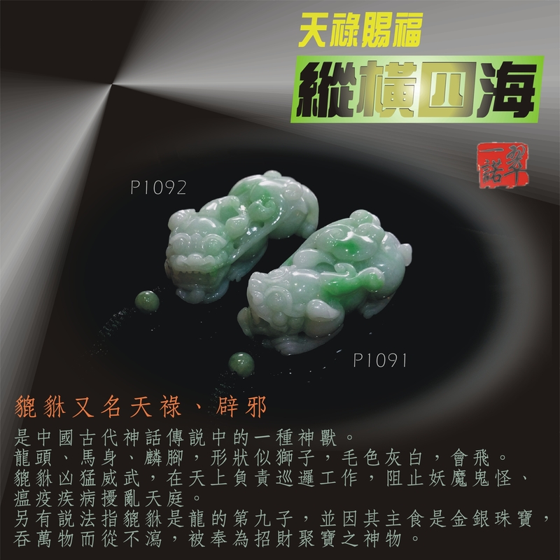 貔貅又名天祿、辟邪。形如獅子,被奉為鎮宅辟邪,和招財聚寶之神物。 喜歡周遊列區、性格豁達的伉儷遠道而來,光臨本店,接走這雙雕工精巧的小貔貅。冀望這雙小貔貅天祿賜福並陪伴樂天伉儷周遊世界,暢遊人生。