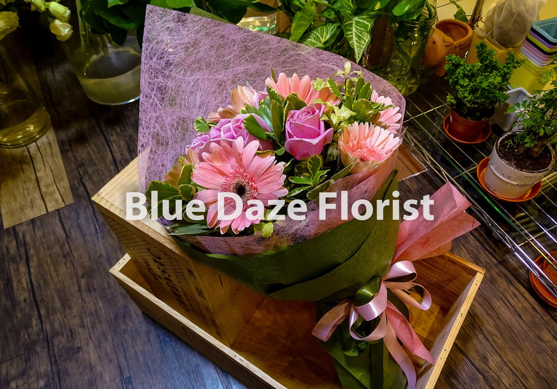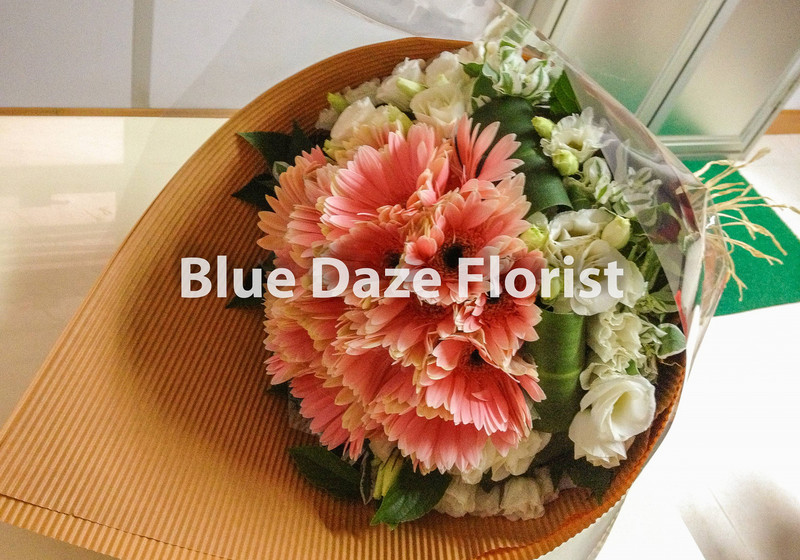 "10支瑪利亞玫瑰,10粉紅色非洲太陽菊,配搭合時襯花和葉"