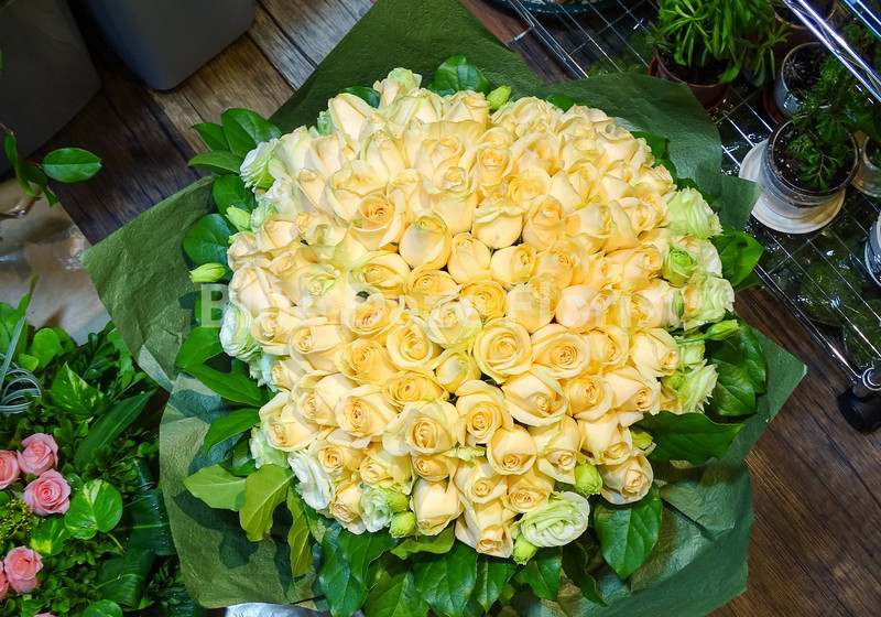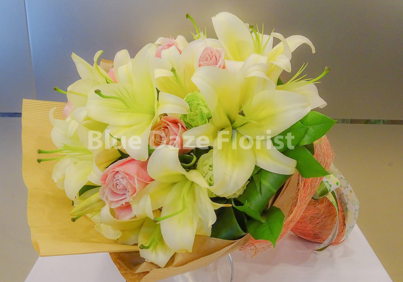 "黃色百合,瑪利亞玫瑰配搭合時襯花和葉"