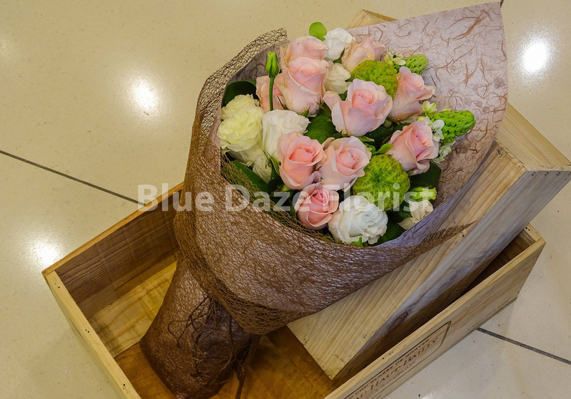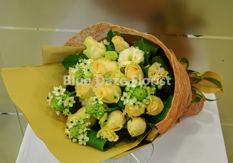 "12支香檳玫瑰,香檳桔梗,白色小牡丹,小雛菊,配搭合時襯花和葉 "