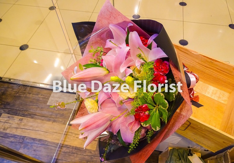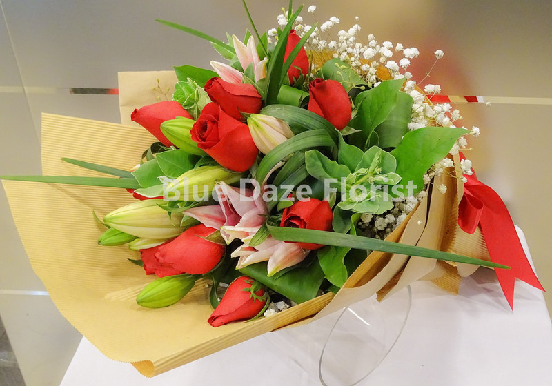 "10支紅玫瑰,粉紅色白合配搭合時襯花和葉"
