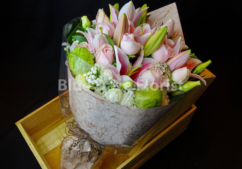 "進口粉色白合,香檳色桔梗配搭合時襯花和葉"