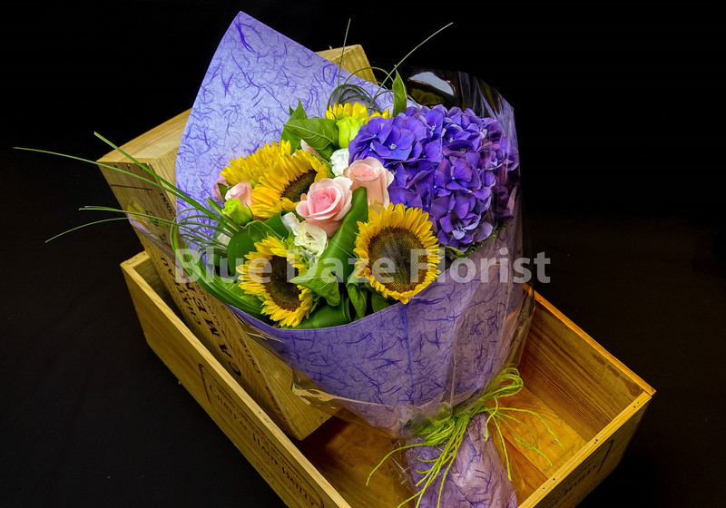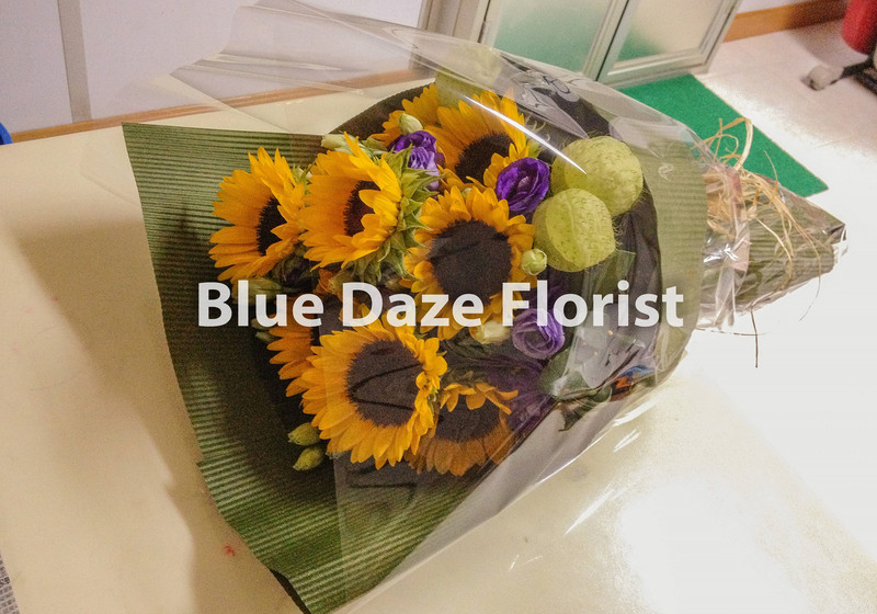 "8支向日葵,紫色桔梗,配搭合時襯花和葉"