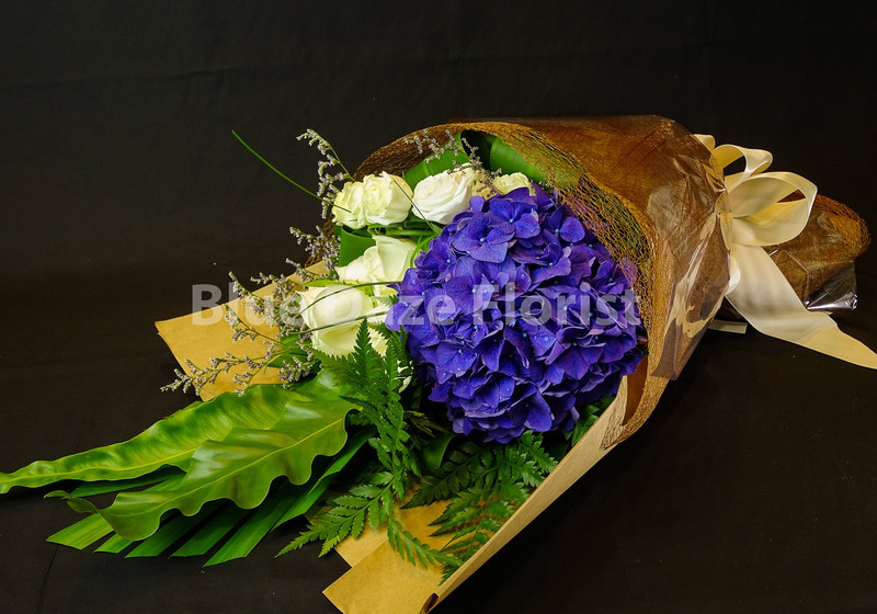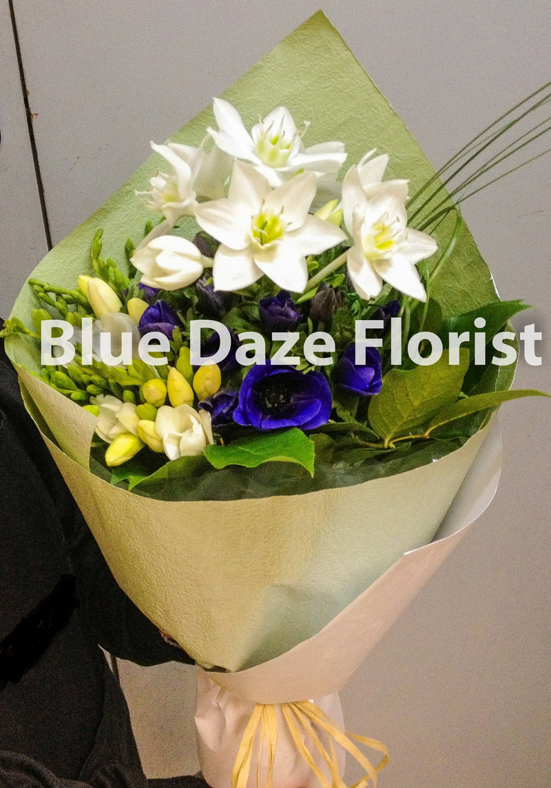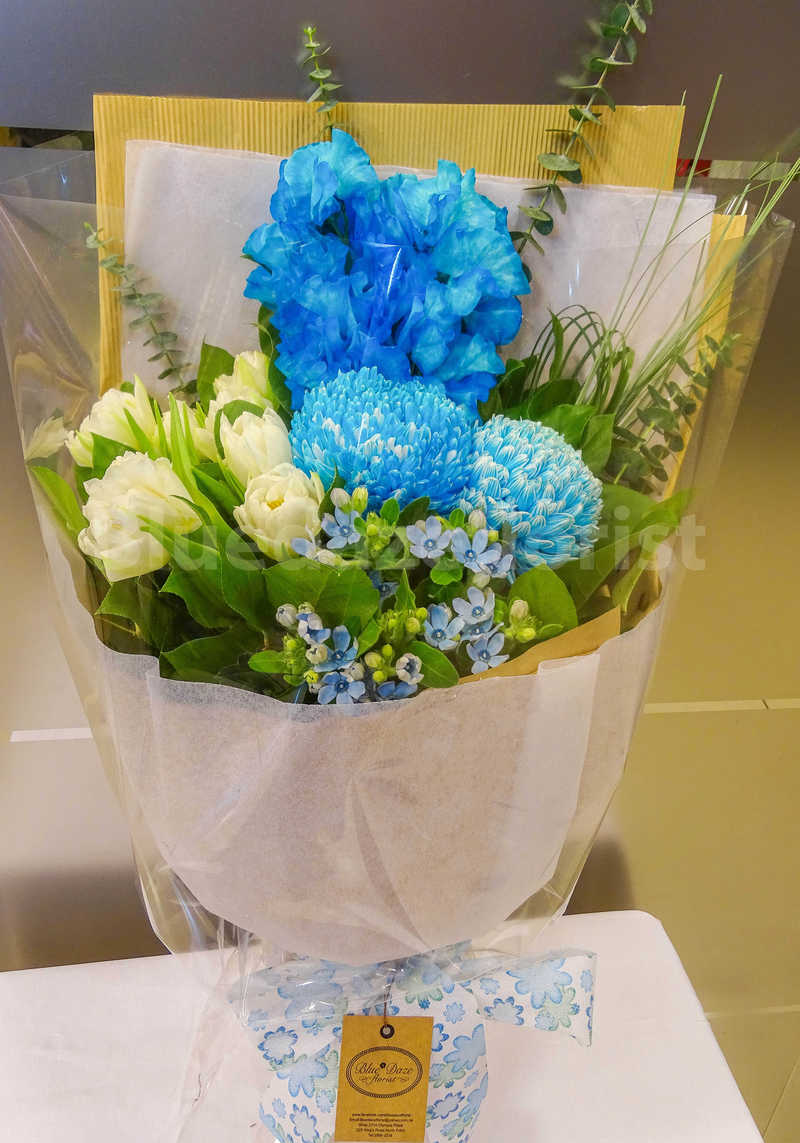 "日本藍星花,日本藍色碗豆花(染色),藍色大波菊(染色),荷蘭白綠鬱金香,配搭合時襯花和葉"