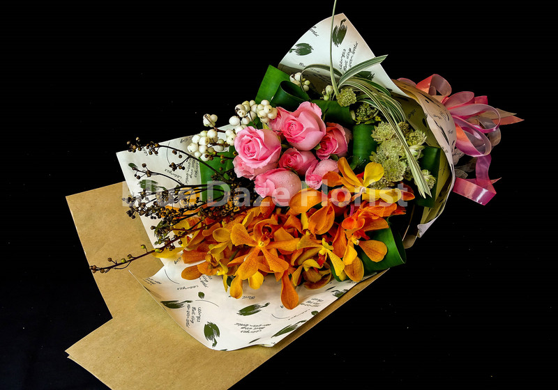 "10支粉紅玫瑰,橙胡姬,配搭合時襯花和葉"