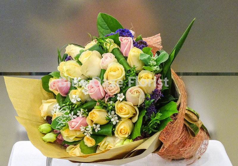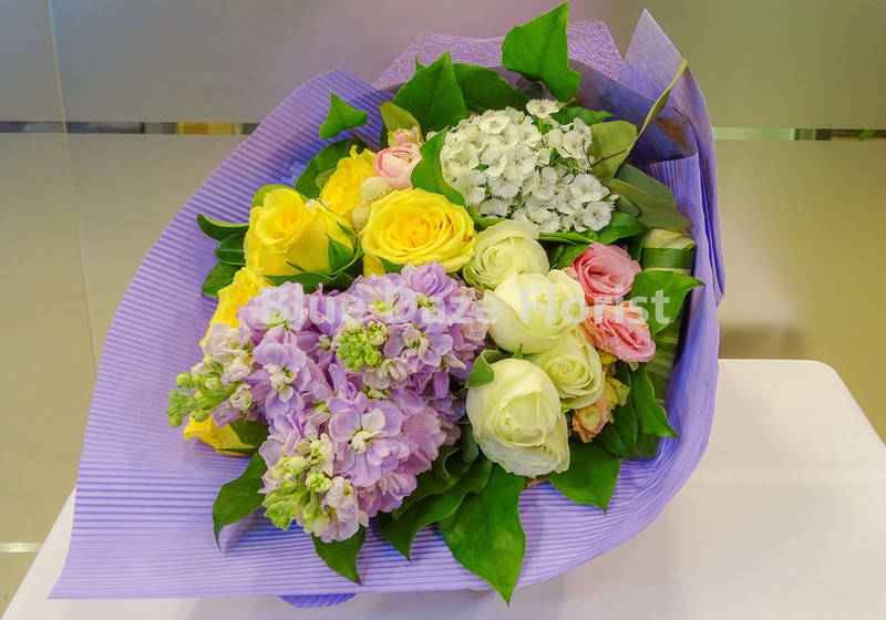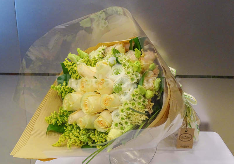"8支黃玫瑰,8支白玫瑰,淺紫麝香,配搭合時襯花和葉"