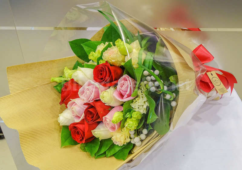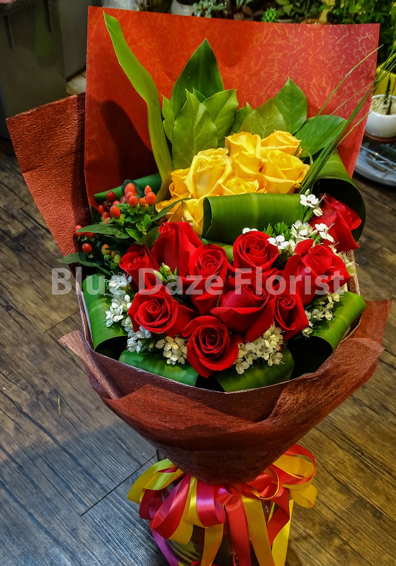 "10支紅色玫瑰,10支黃色玫瑰,配搭合時襯花和葉"