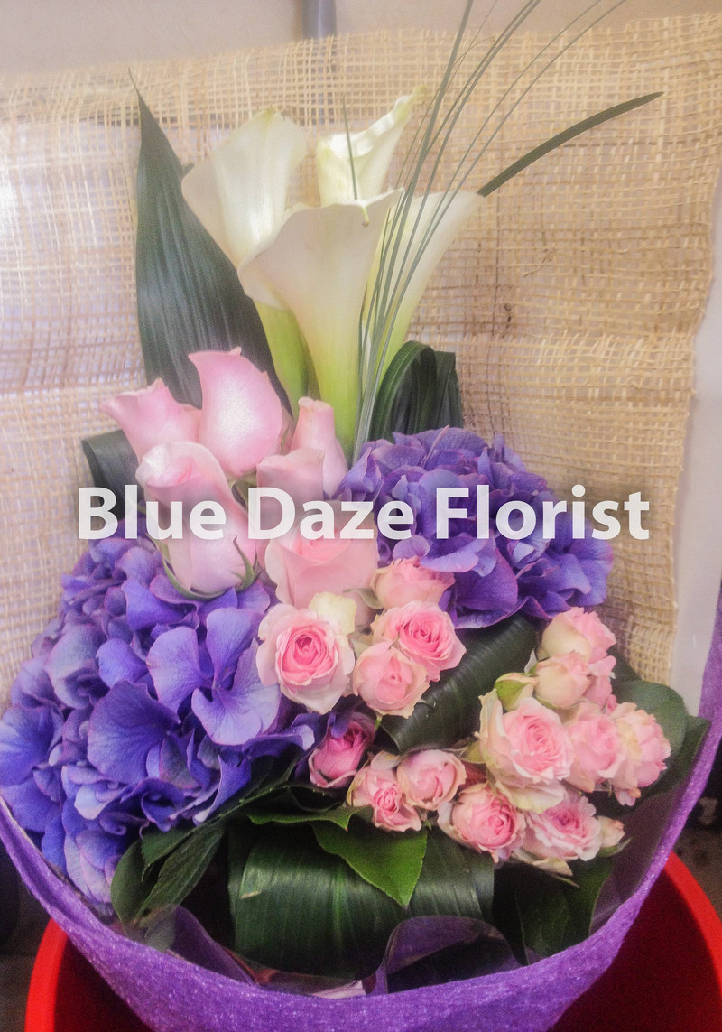 "2支大绣球,6支粉紅玫瑰,白色馬蹄蘭,粉色小玫瑰,配搭合時襯葉"