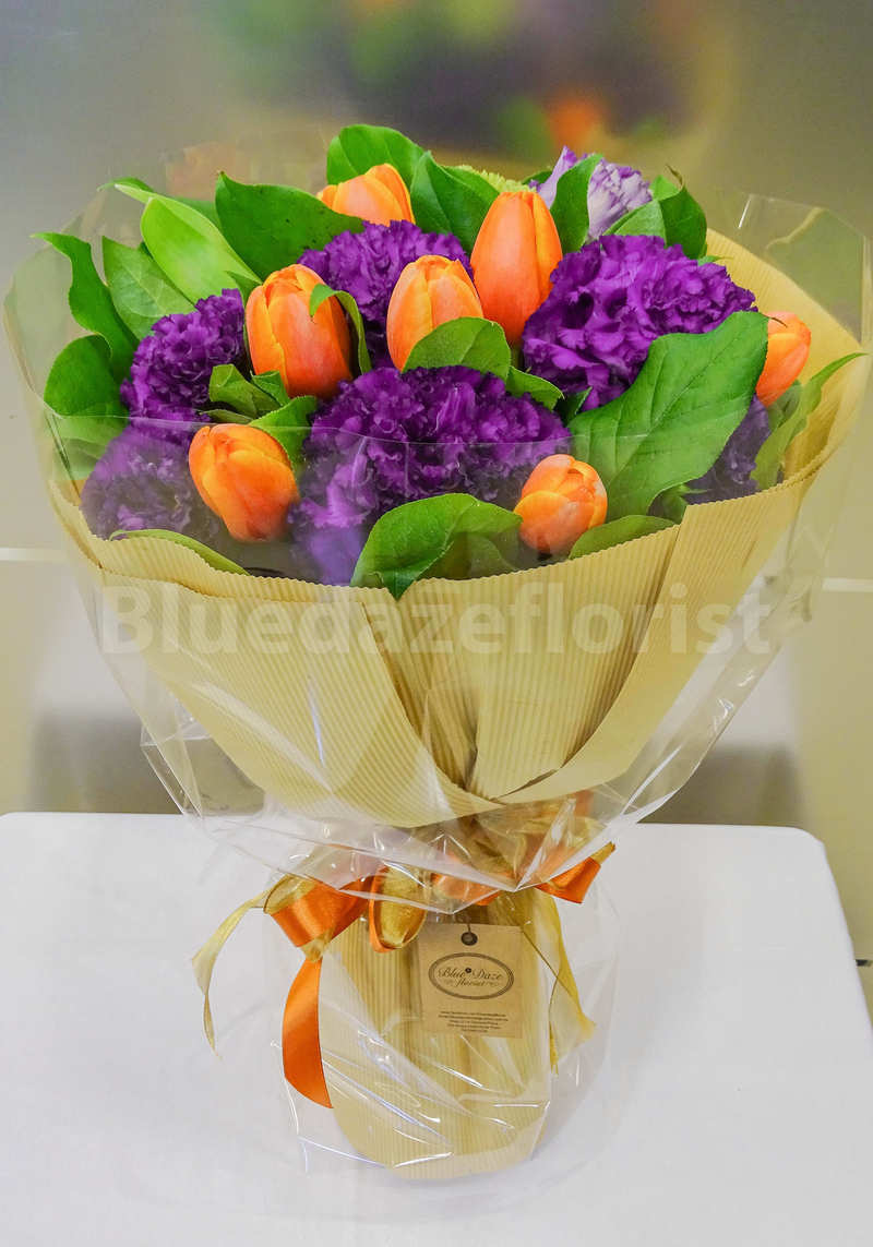 "台灣紫色桔梗,橙色鬱金香,配搭合時襯花和葉"