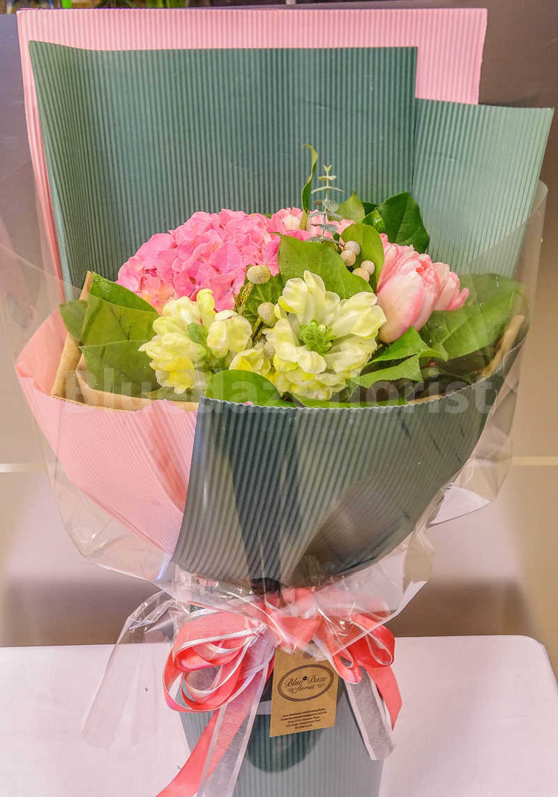"粉色大绣球花,粉色鬱金香,黃色金魚花,配搭合時襯花和葉"