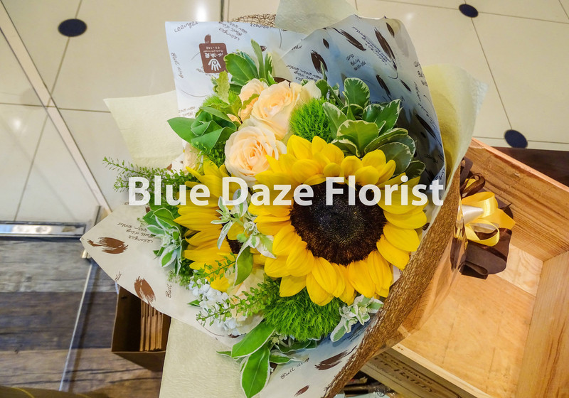 "香檳色玫瑰,2支向日葵,配搭合時襯花和葉"