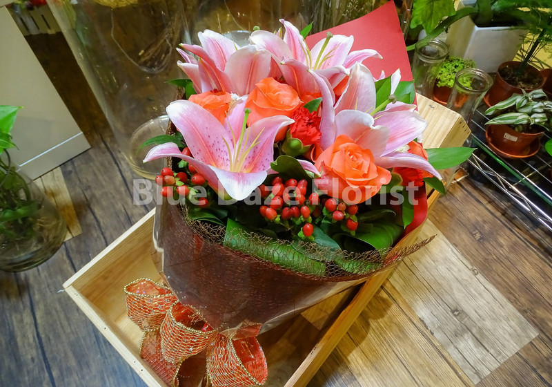"10支橙玫瑰,粉紅色白合配搭合時襯花和葉"
