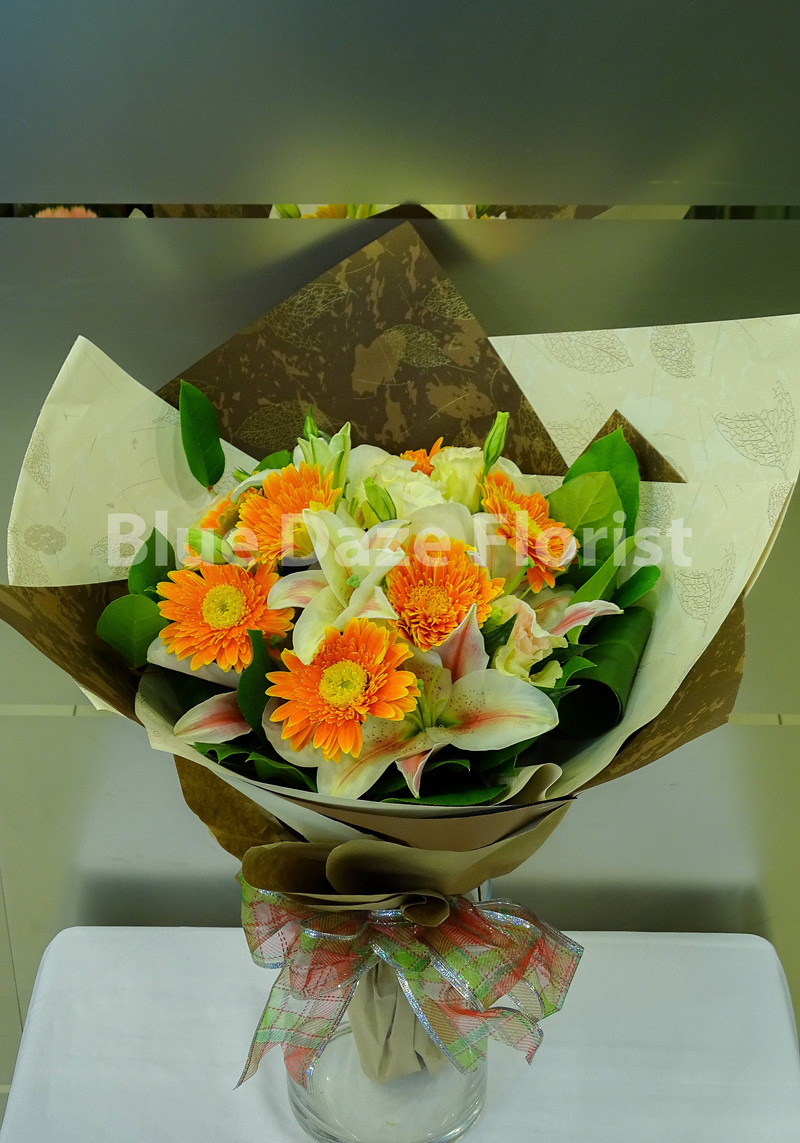 "橙色非洲太陽菊,粉紅色白合,香檳色桔梗,配搭合時襯葉"