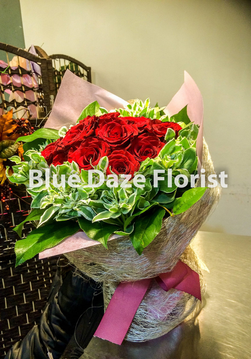"12支粉紅色玫瑰,大眼雀梅配搭合時襯花和葉"