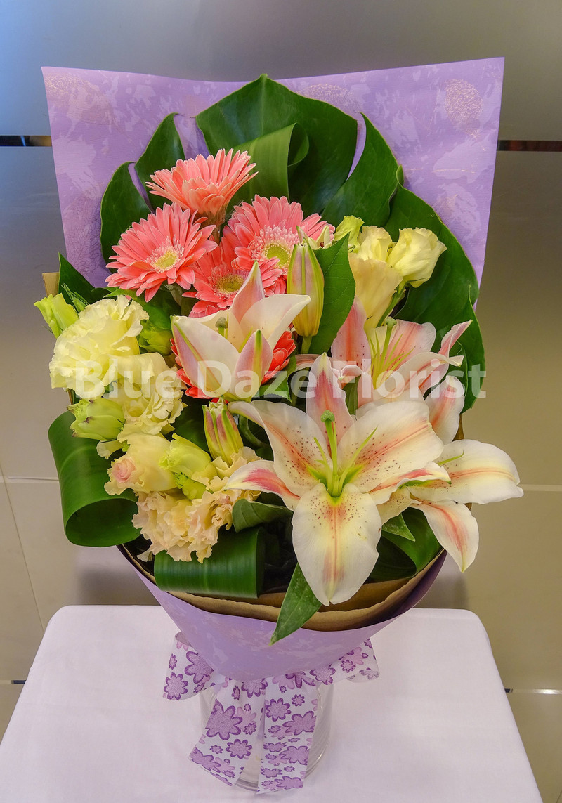 "6支粉色非洲太陽菊,粉紅色白合,香檳色桔梗,配搭合時襯葉"