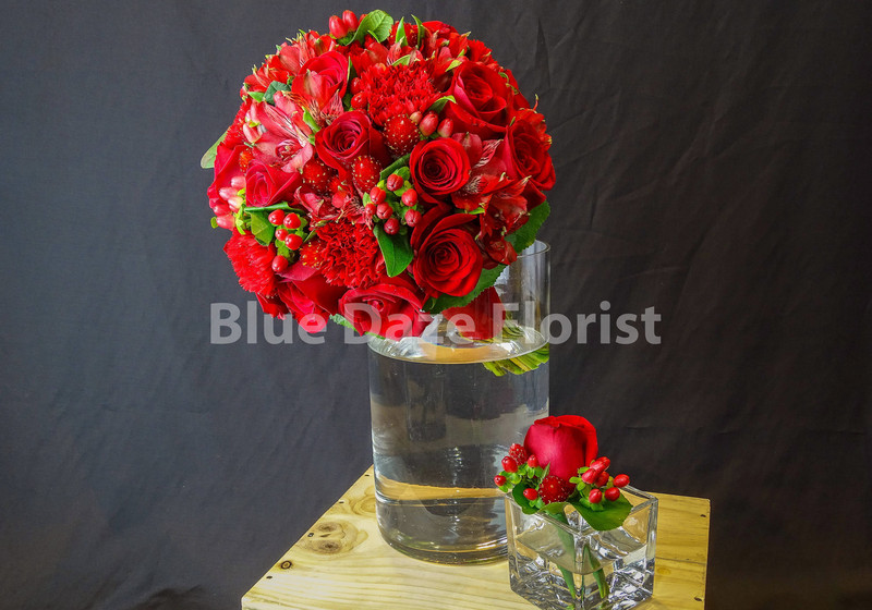 "紅玫瑰,千日紅,紅豆子,紅康乃馨,配襯葉子造型(連新郎襟花)"
