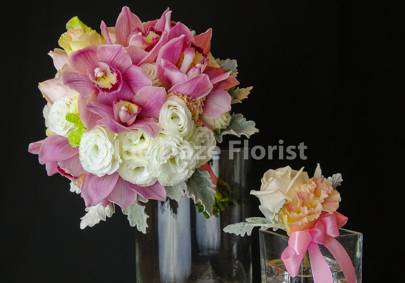 "粉色蕙蘭,白色桔梗,象牙玫瑰,銀絨葉,(連新郎襟花)"