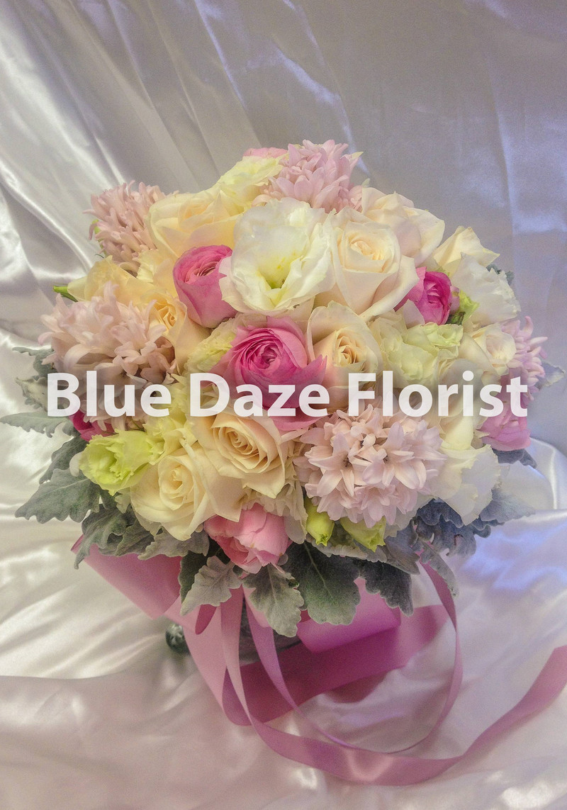 "淺粉色風信子,白桔梗,粉色小牡丹,象牙玫瑰,銀絨葉,(連新郎襟花)"