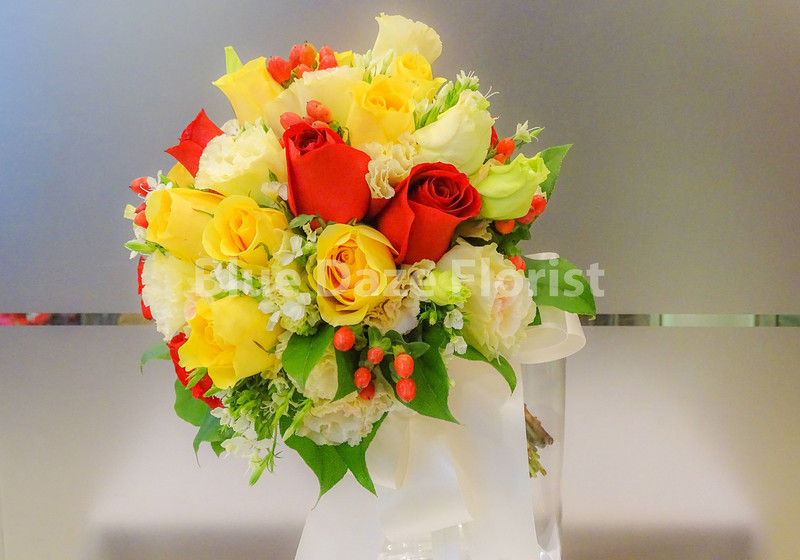 "紅玫瑰,黃玫瑰,白美女櫻,香檳桔梗,配襯葉子造型(連新郎襟花)"