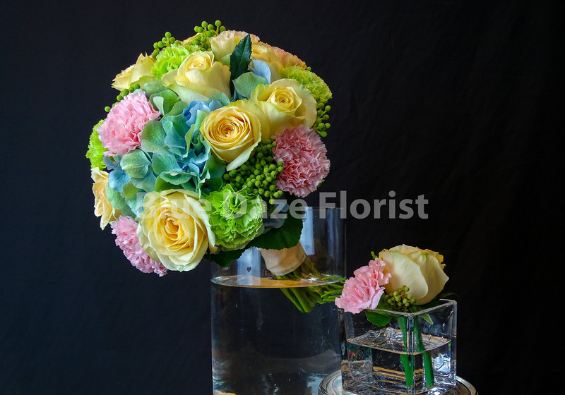 "黃玫瑰,綠康乃馨,粉康乃馨,秋色绣球,綠小足球,配襯葉子造型(連新郎襟花)"