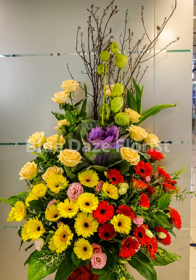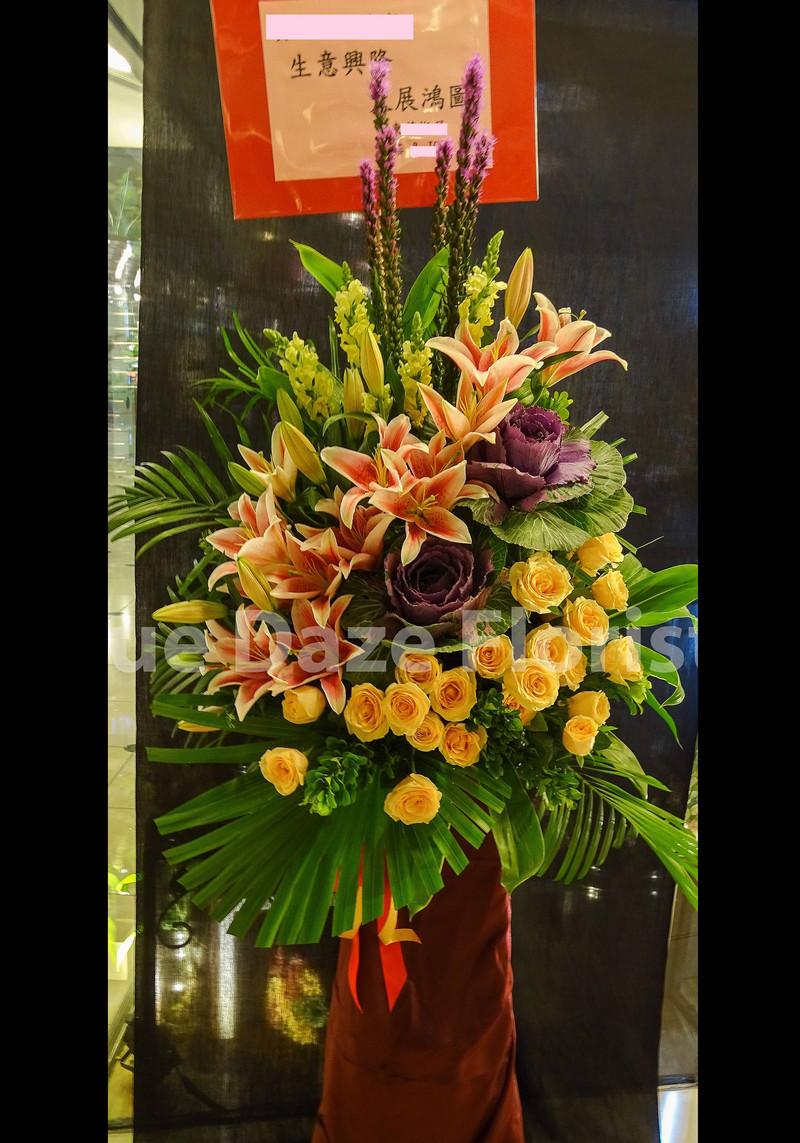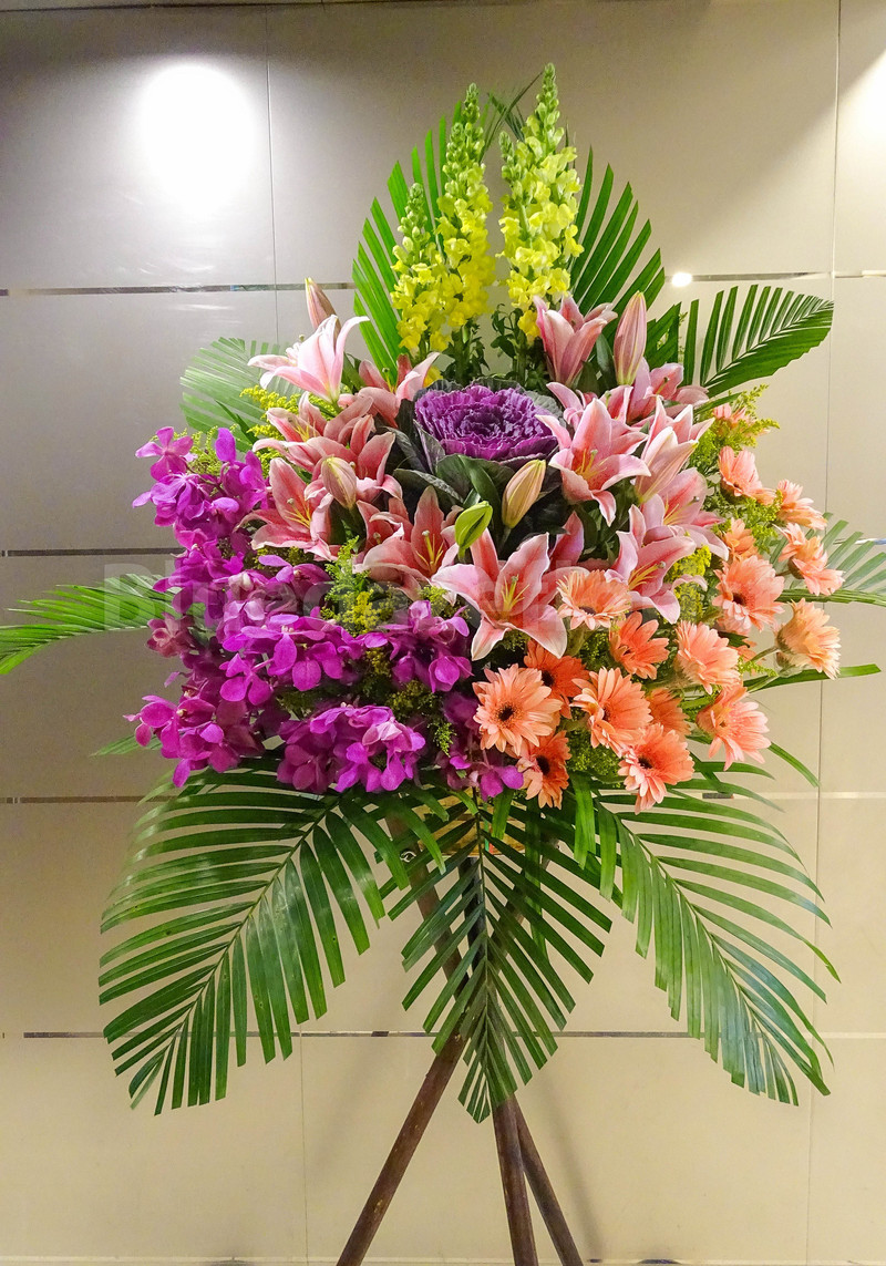 "紫胡姬,粉百合,葉牡丹,粉色太陽花,黃色金魚花,配搭新鮮時花和葉"(木腳架)