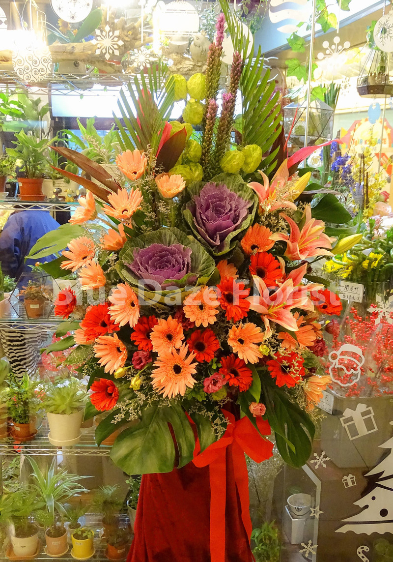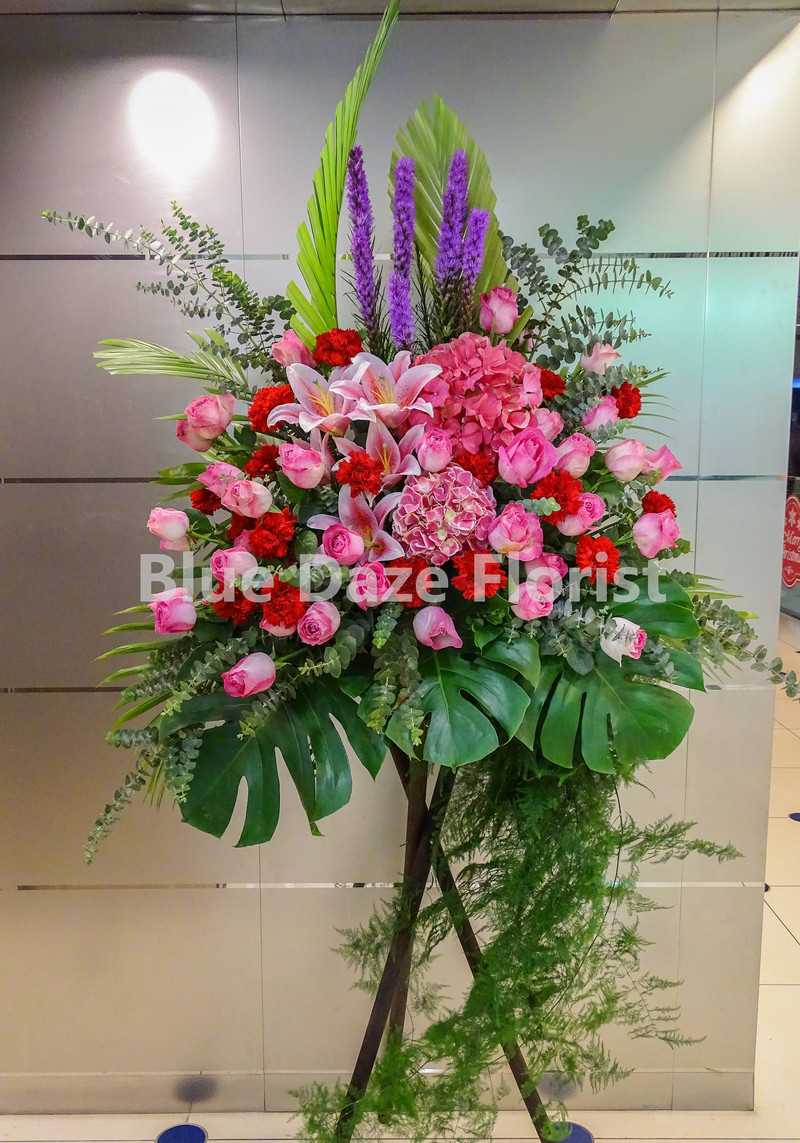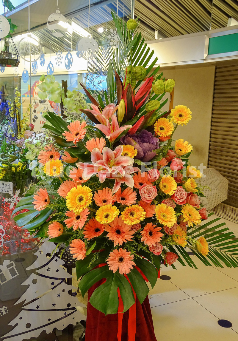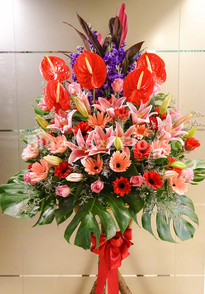 "紫胡姬,粉百合,葉牡丹,粉色太陽花,黃色金魚花,配搭新鮮時花和葉"(木腳架)