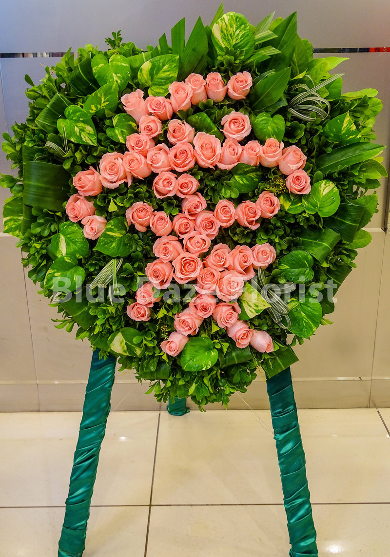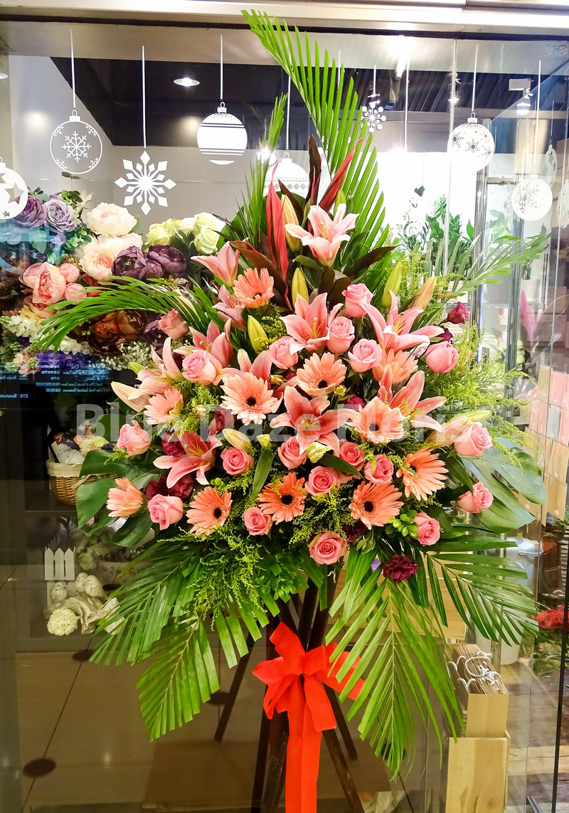 "粉綉球,粉邊玫瑰,粉百合,馬尾,紅色康乃馨,文竹造型配搭新鮮時花和葉"(木腳架)