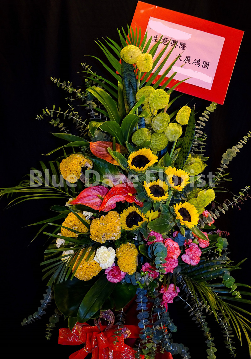 "黃色雞冠花,向日葵,紅掌,配搭新鮮時花和葉