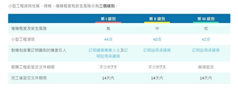 小型工程監管制度旨在方便樓宇業主及佔用人循簡化規定,合法及安全地進行小規模建築工程。 小型工程按其性質、規模、複雜程度和安全風險分為三個級別。 服務範圍