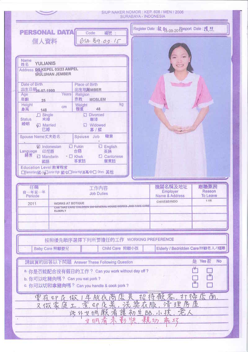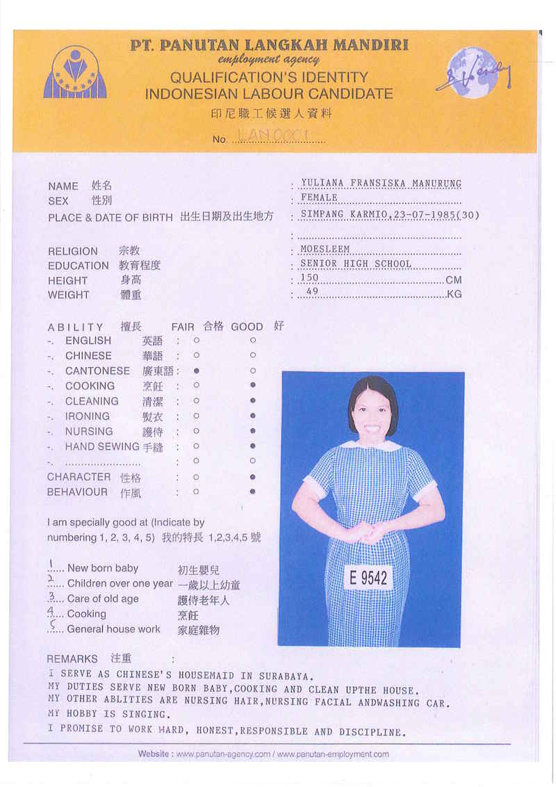 YULIANA 30歲, 為華人家庭工作, 照顧小孩, 煮華人菜, 工作勤勞, 有爱心, 有耐心, 成實, 有禮, 聽話, 愿意照願初生BB、老人和做任何工作, 能自動完成工作。