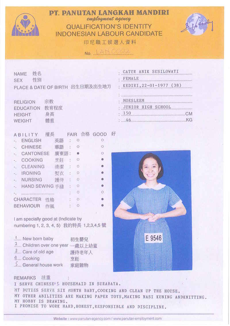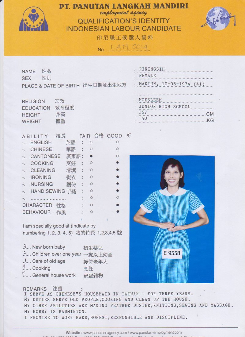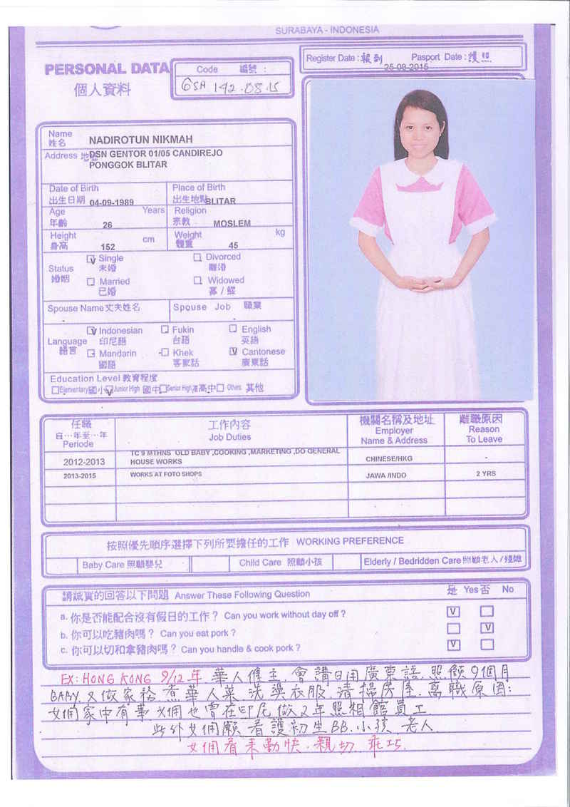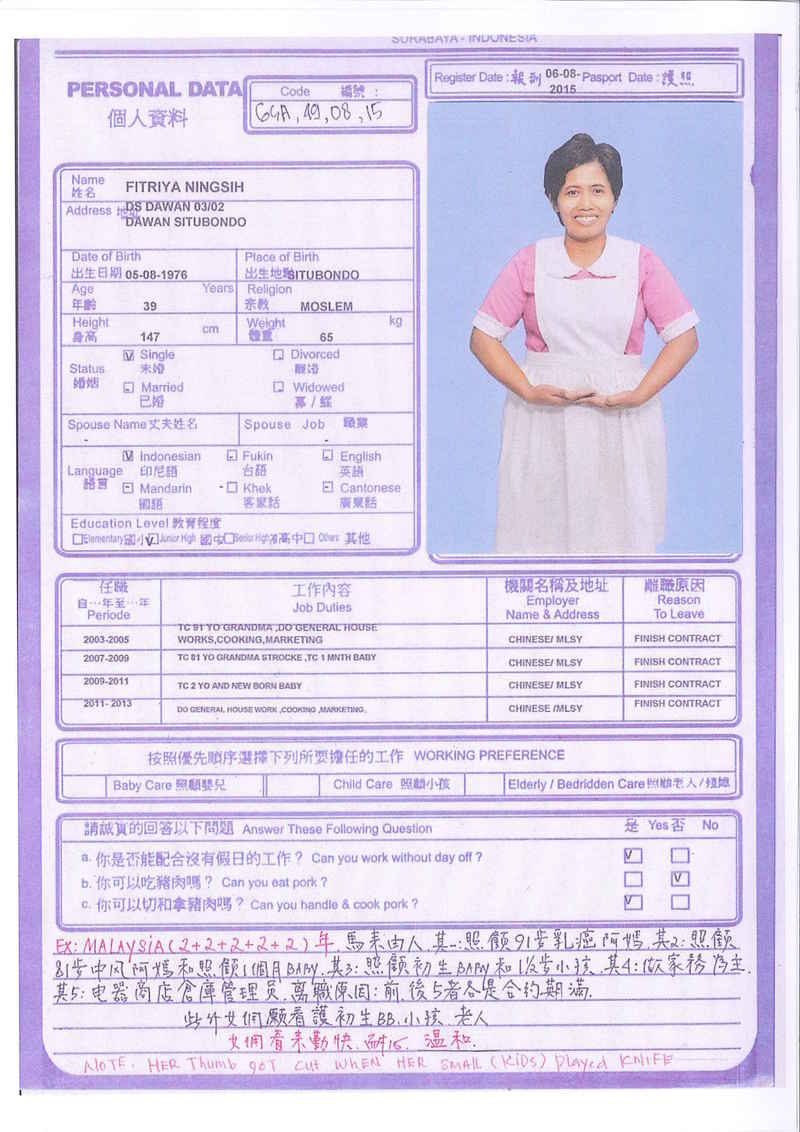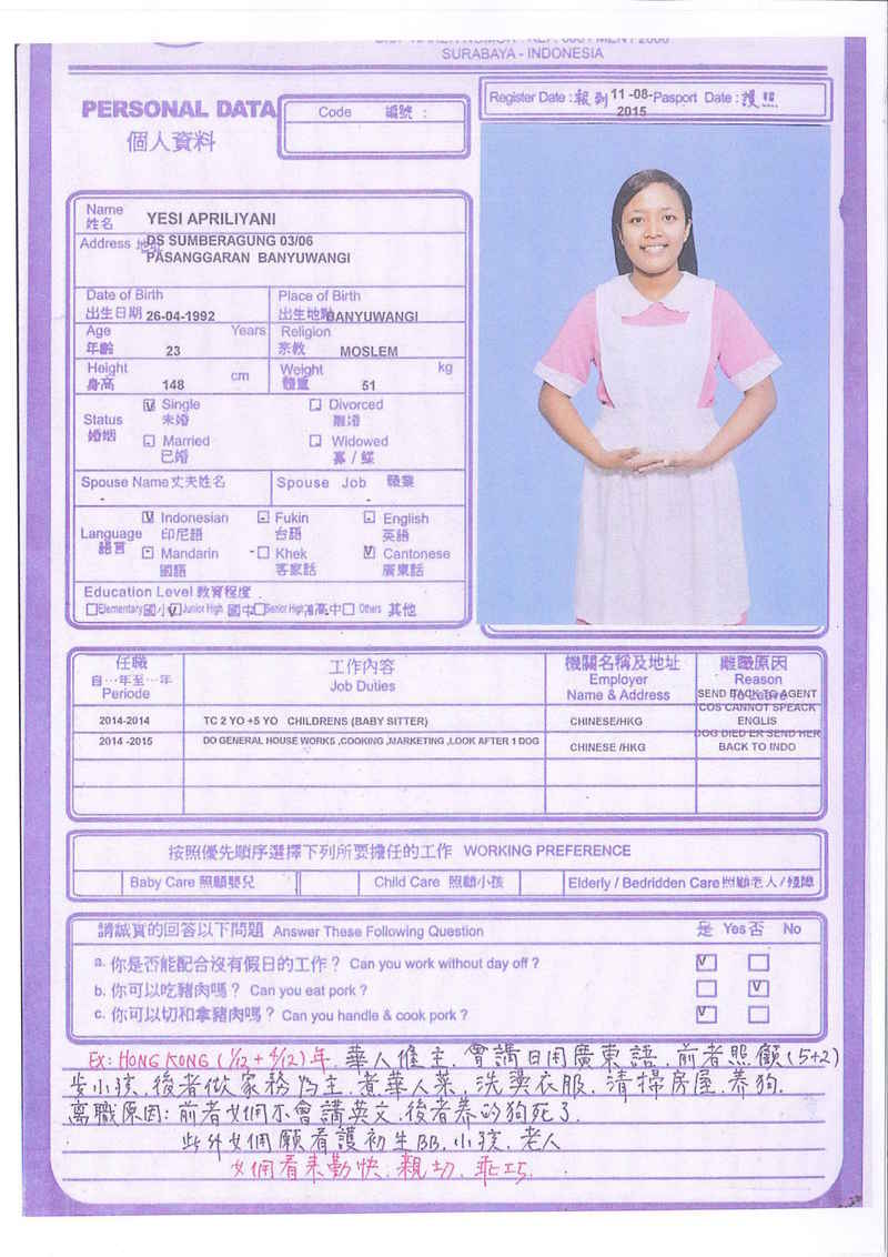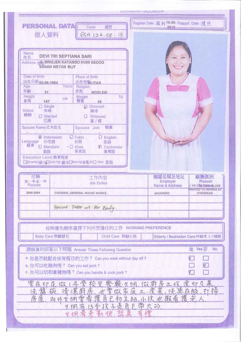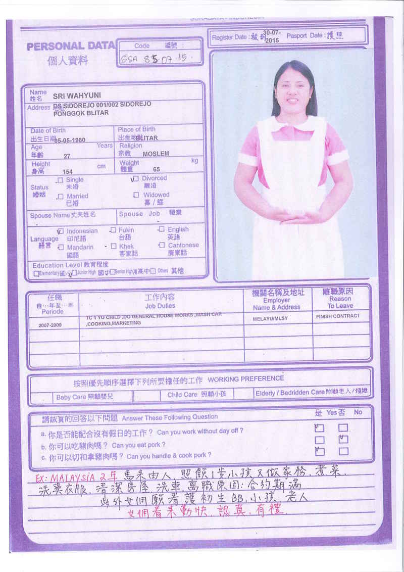 Sri,40歲,未婚,英文和廣東話,1998開始香港工作,2006-2015年香港同一僱主完約,家務料理,烹飪買菜,經驗豐富,聰明。