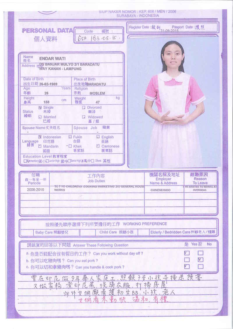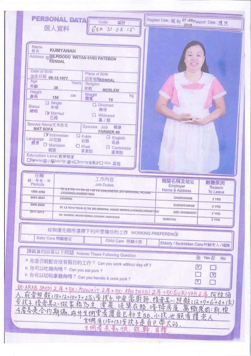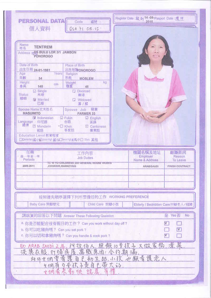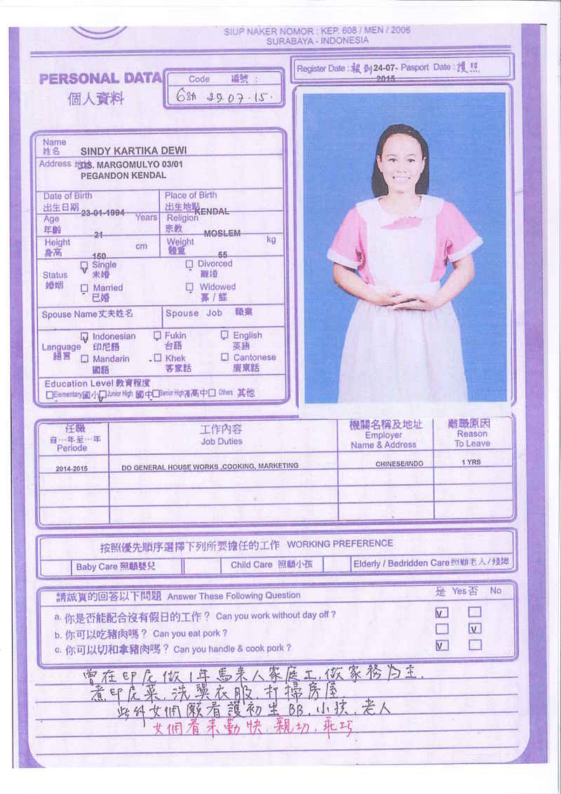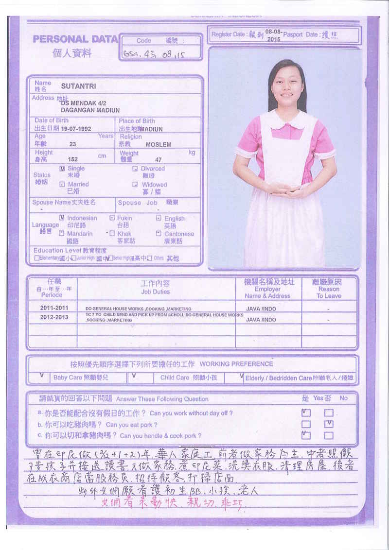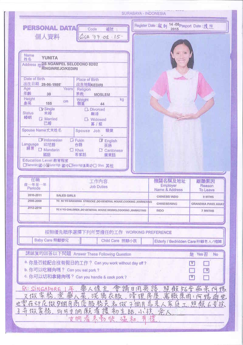 Sri,40歲,未婚,英文和廣東話,1998開始香港工作,2006-2015年香港同一僱主完約,家務料理,烹飪買菜,經驗豐富,聰明。