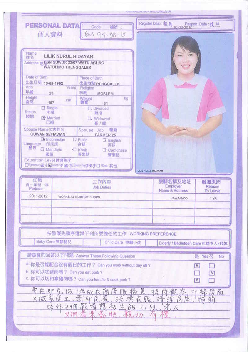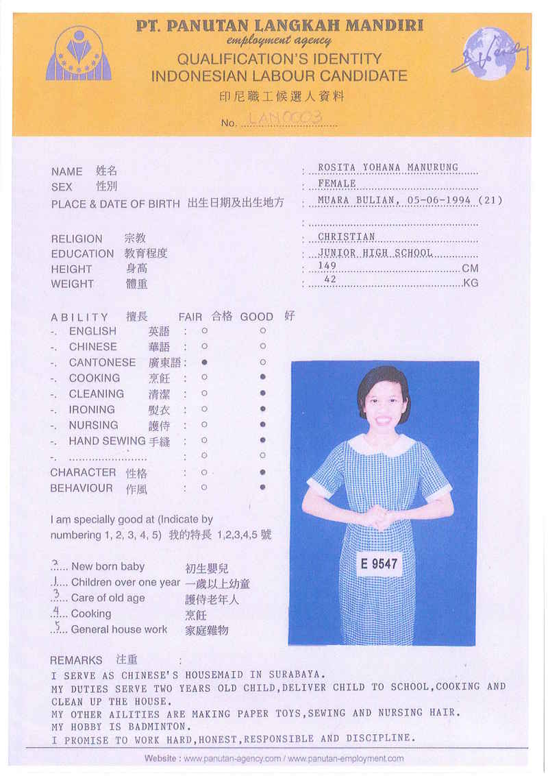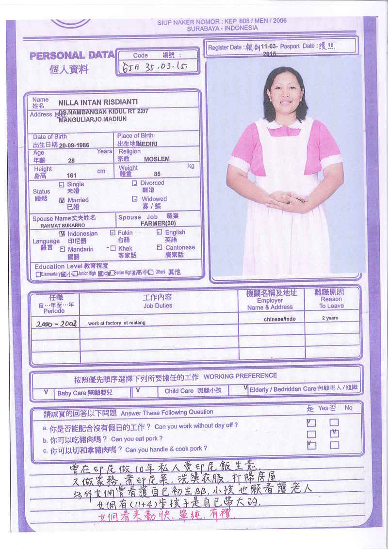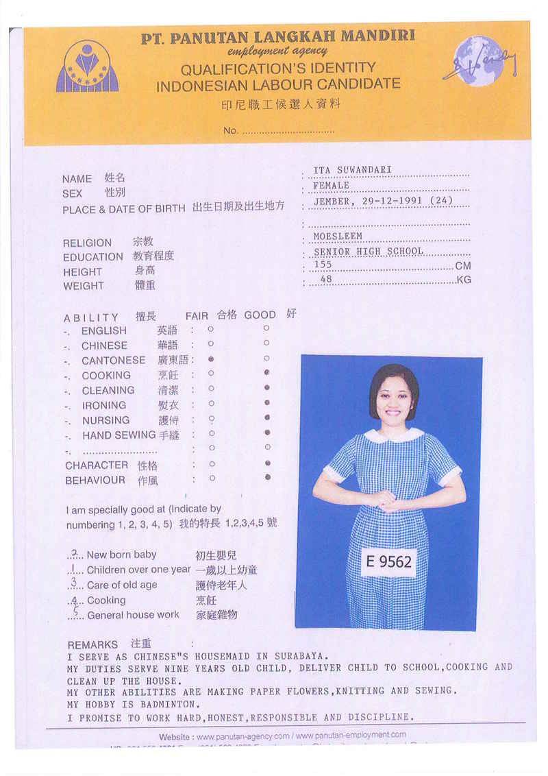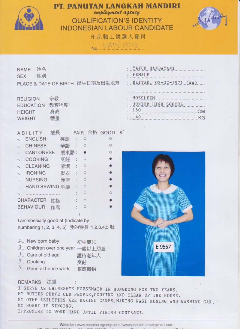 Afrida,23歲,已婚育有2名子女,廣東話,香港工作2個月,家務料理,照顧嬰兒和小孩,烹飪買菜,經驗豐富,聽話。