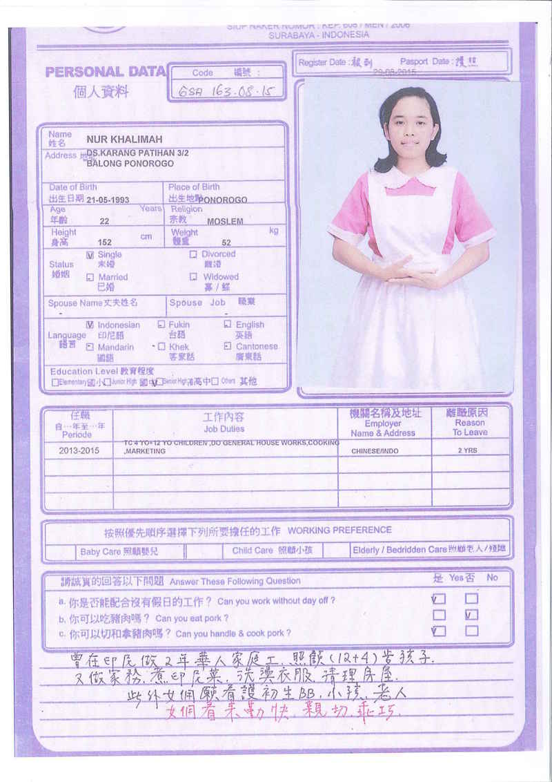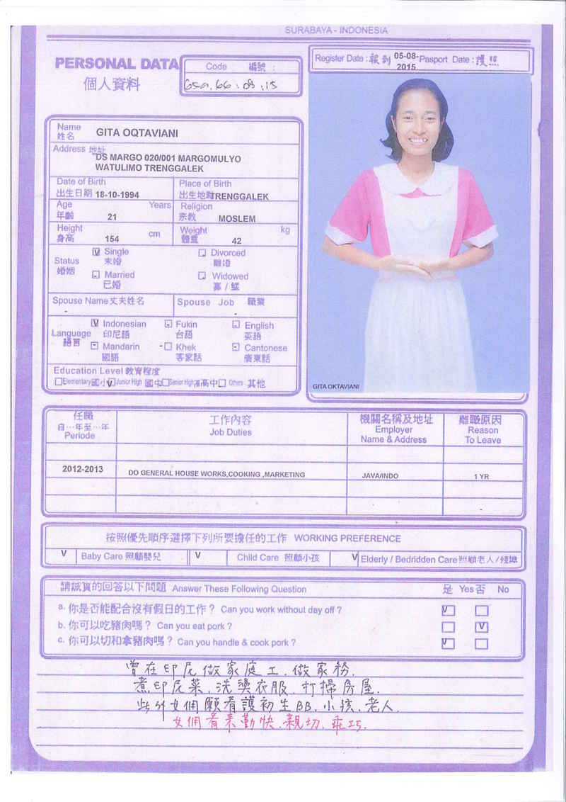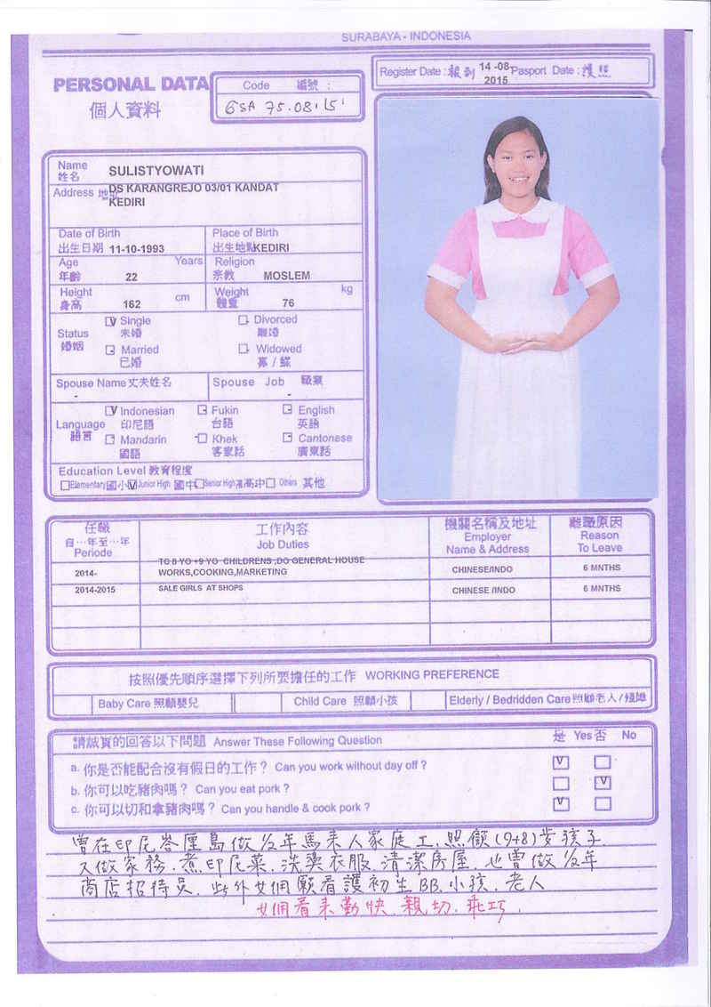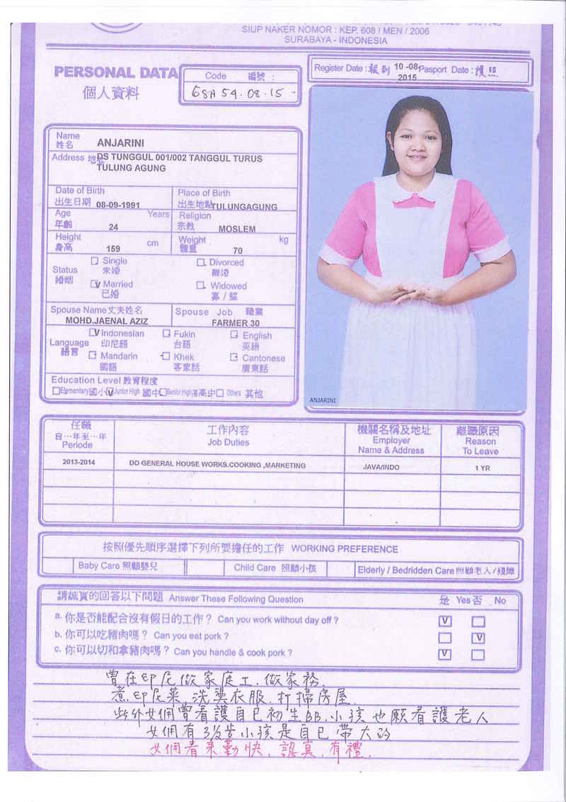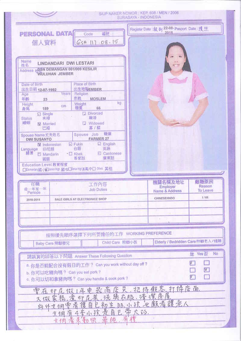 Afrida,23歲,已婚育有2名子女,廣東話,香港工作2個月,家務料理,照顧嬰兒和小孩,烹飪買菜,經驗豐富,聽話。