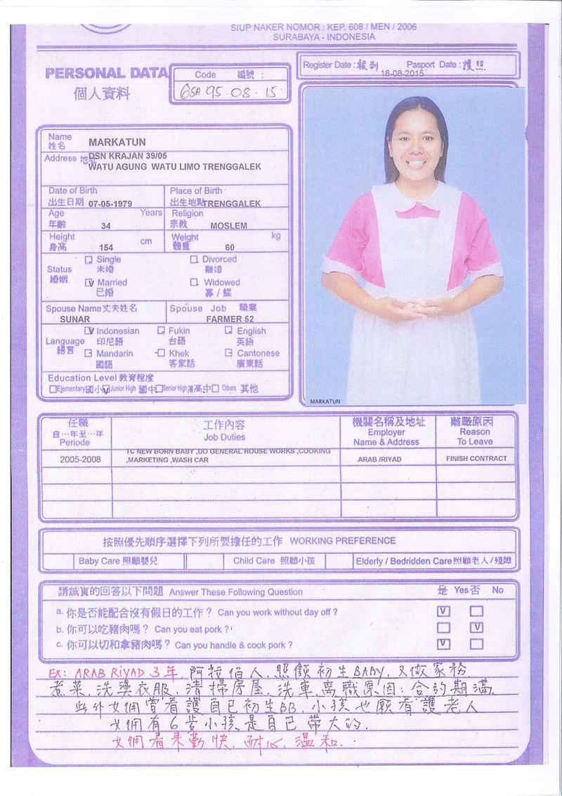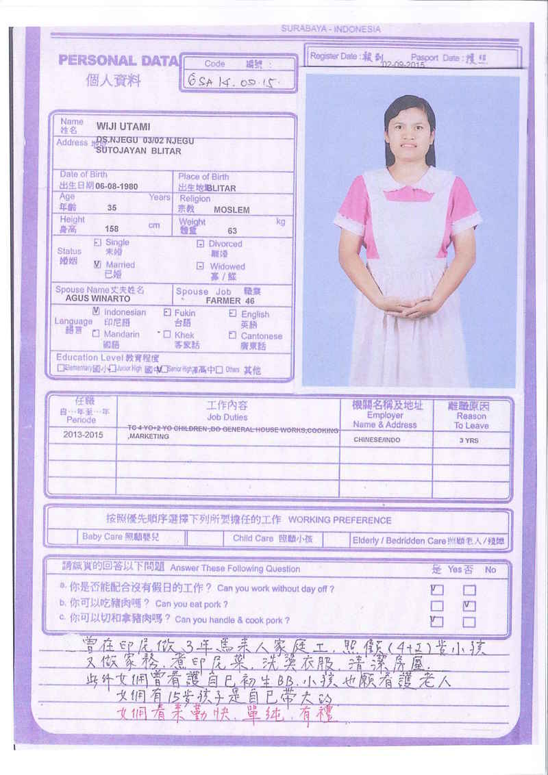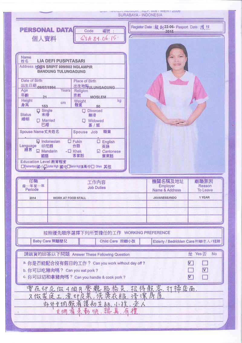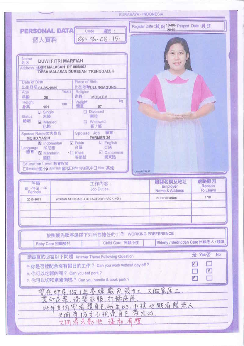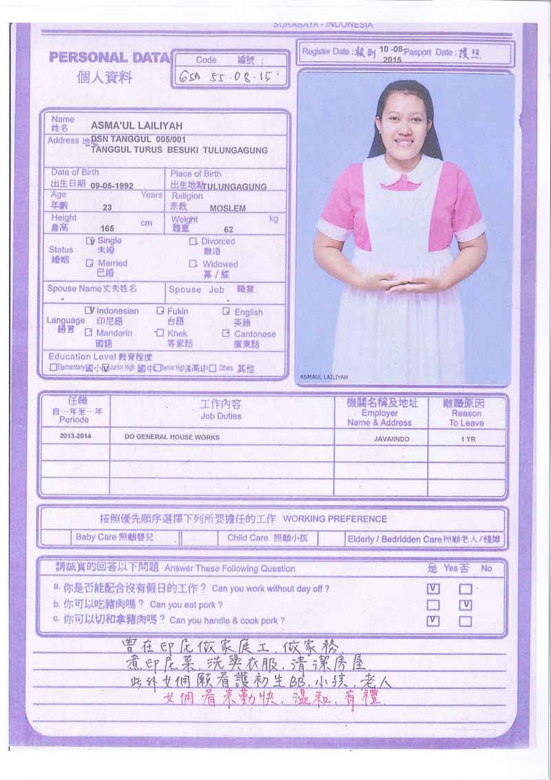 Afrida,23歲,已婚育有2名子女,廣東話,香港工作2個月,家務料理,照顧嬰兒和小孩,烹飪買菜,經驗豐富,聽話。