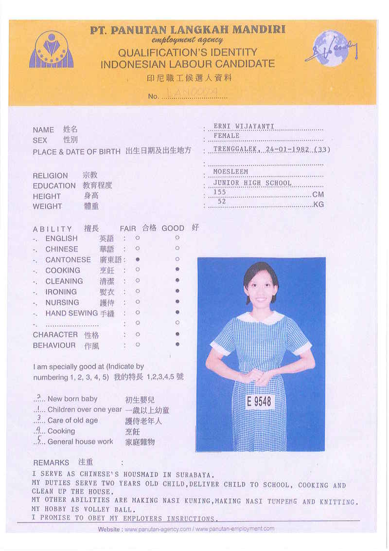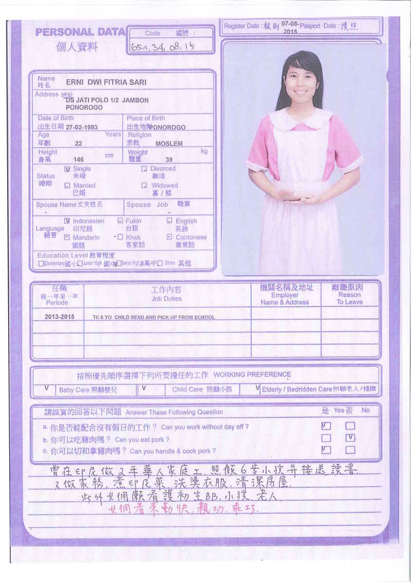 ERNI 33歲, 照顧嬰孩, 照顧老人, 工作勤勞, 有爱心, 有耐心, 成實, 有禮, 聽話, 愿意做任何工作, 能自動完成工作。