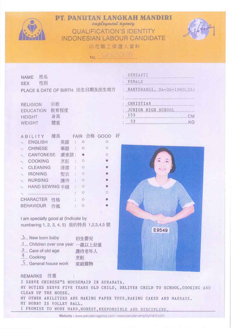 SEMIARTI 35歲, 照顧嬰孩, 照顧老人, 工作勤勞, 有爱心, 有耐心, 成實, 有禮, 聽話, 愿意做任何工作, 能自動完成工作。