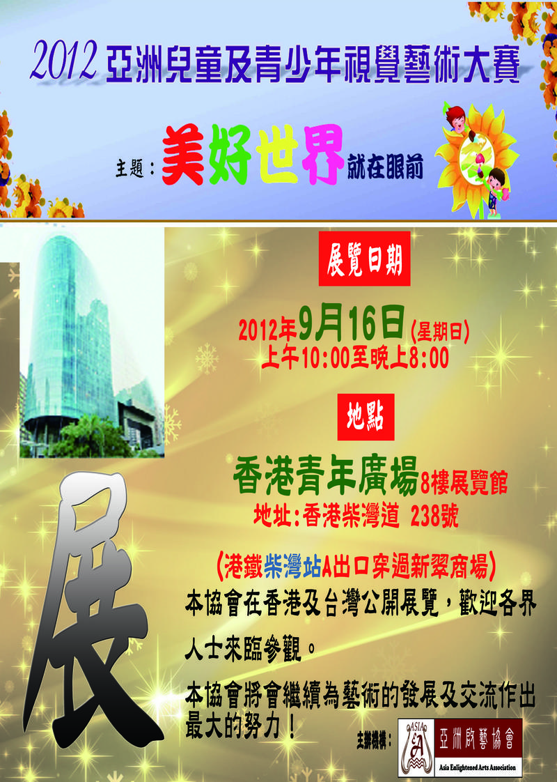 2012年9月16日(星期日)早上10:00至晚上8:00在青年廣場8樓展覽館展出參賽中優異的作品。