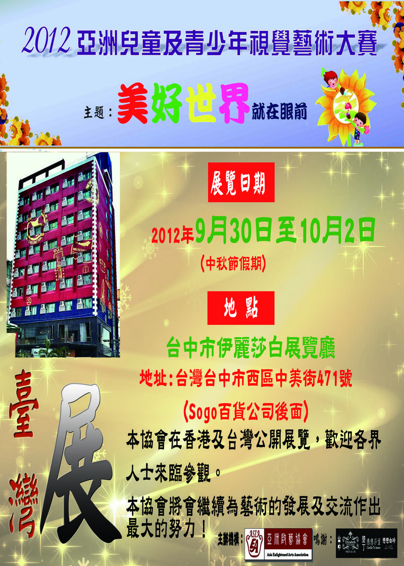 2012年9月30、10月1日和10月2日,亞洲啟藝協會受台灣「藝術文化之都─台中」邀請,將今次的視藝比賽作品擺放在當地的伊麗莎白展覽廳作展覽,並會開放及當地居民和學校作參觀,機會難得,可以實行將香港文化推廣至亞洲地區。